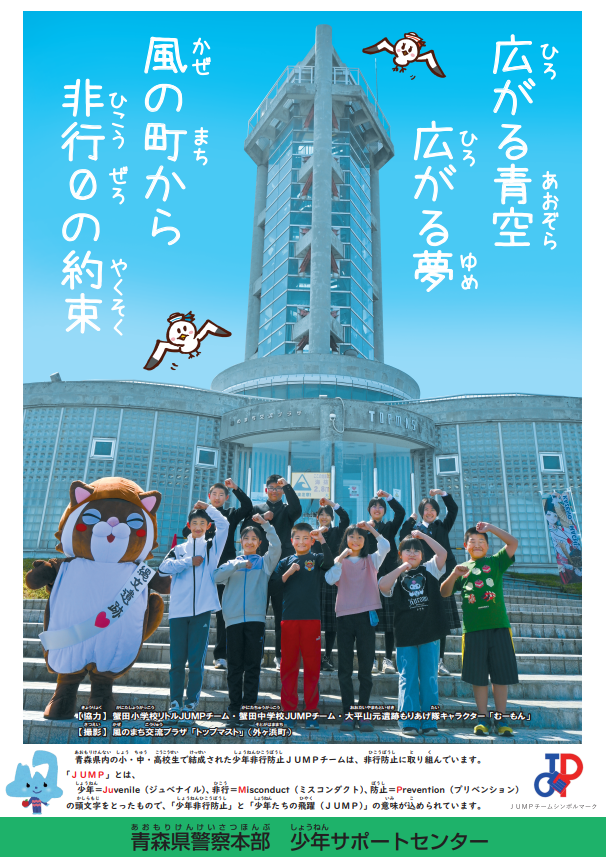 青森県警察では、平成17年度より、毎年、各地区の少年非行防止JUMPチームをモデルとして「少年非行防止広報ポスター」を作成しています。