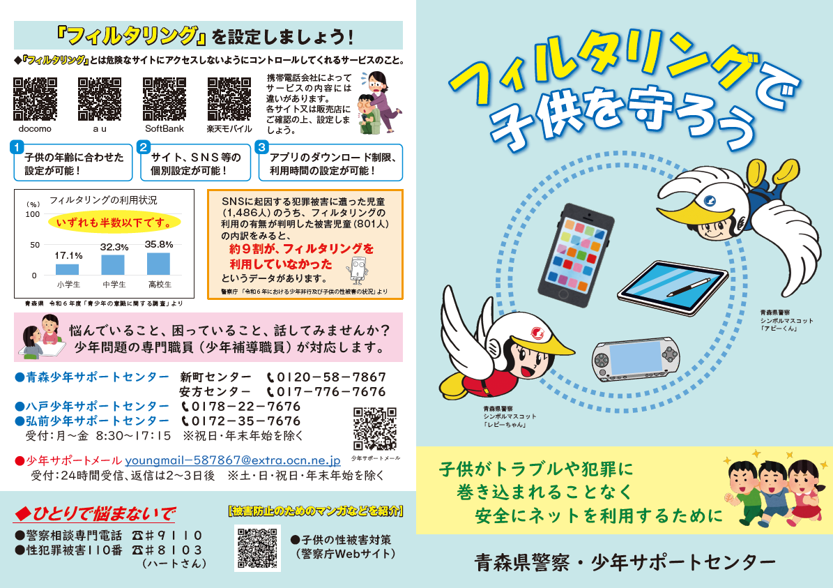 リーフレット「フィルタリングで子供を守ろう」は、保護者のみなさんに子供たちをインターネットの有害情報や犯罪から守る手段である「フィルタリング」の活用を呼び掛けるために作成したものです。